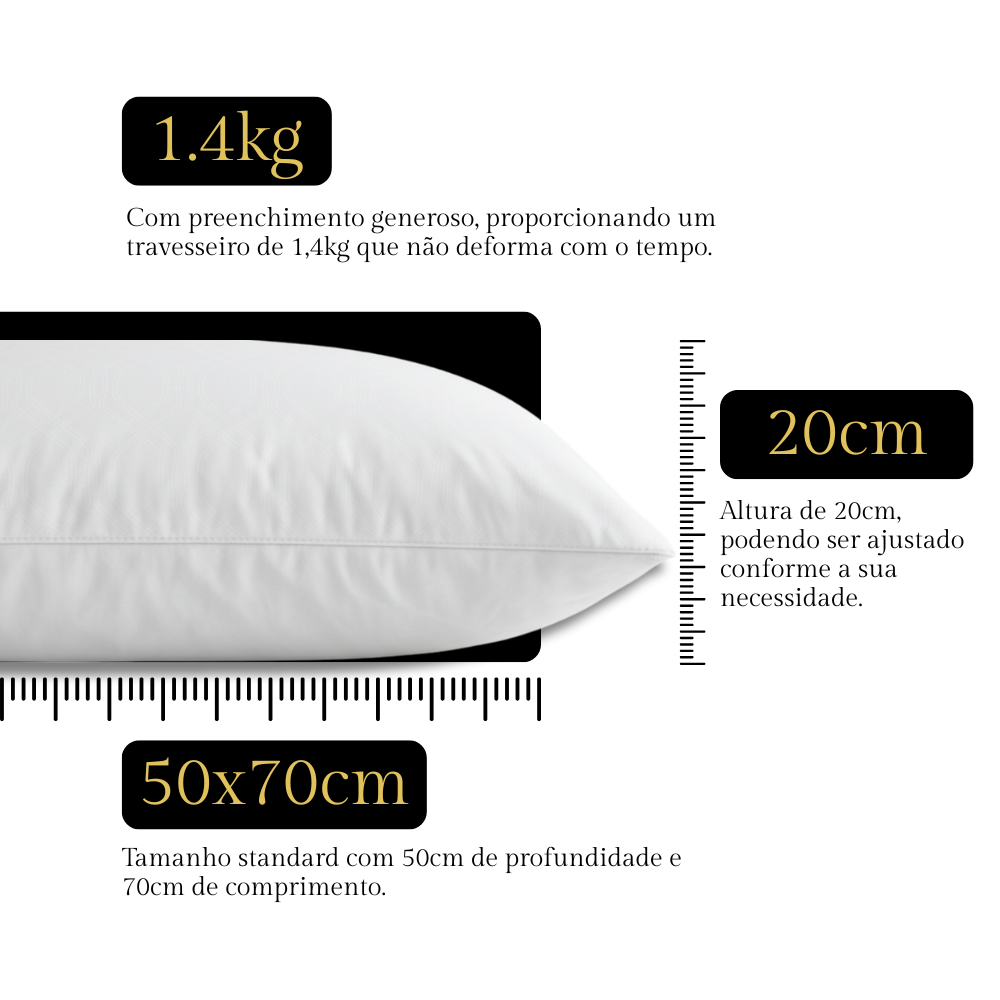 Medindo 50x70cm,aé ideal para quem deseja um travesseiro tradicional, mas com desempenho superior. Perfeito para quem valoriza durabilidade, sofisticação e um descanso verdadeiramente reparador.