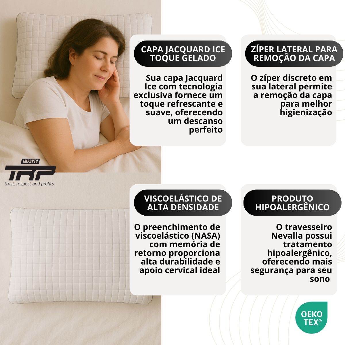 Espuma Viscoelástica Premium: Alta densidade que se molda perfeitamente aos contornos da cabeça e pescoço, proporcionando suporte ergonômico e alívio de pressão.